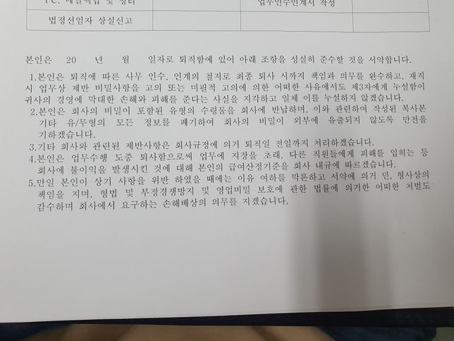 - 구조조정고용·노동똑똑한비오리72회사가 정한 사직서에 무조건 사인해야하나요?회사 경영악화로 인해 희망퇴직 신청을 받아서 희망퇴직을 신청했습니다.신청 후에 별 말이 없다가 오늘이 28일인데 30일까지 사직서를 제출하라고했는데 회사에서 요구한 사직서 양식에 이렇게 몇가지 사항들이 적혀있는데4번을 보면 업무수행중 퇴사라고 쓰여있는데 저같은 경우는 회사가 정한 날짜에 퇴사를 하는건데 저런게 적혀있는 사직서에 사인해도 되는건가요??!13명의 전문가가 답변했어요