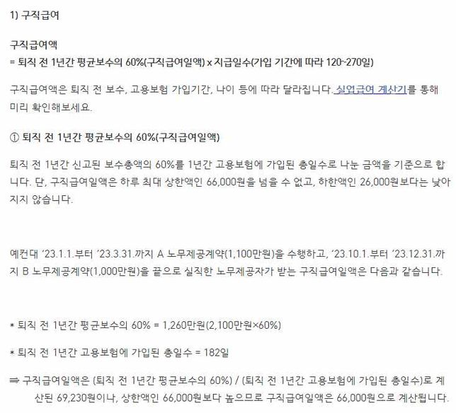 - 임금·급여고용·노동과자가된두부실업급여 구직급여액 계산해주세요!A회사 : 2025년 1월~09월까지 근무, 월급여: 110만원(주5일/일 4시간 근무), 상용직, 자발적퇴사B회사 : 2025년 10월~2026년 1월까지 근무, 월급여 230만원(주5일/일 8시간 근무), 상용직, 비자발적퇴사제가 알고있는 구직급여일액 계산법은 퇴직전 3개월 평균임금의 60%를 계산했을때, 하한액보다 적을경우 당시의 하한액금액, 상한액보다 많을경우 상한액 금액을 구직급여일액으로 환산해서 소정급여일수를 곱한 금액이 실업급여금액으로 알고있는데,첨부한 사진에 나와있는 구직급여액 정산법에는 퇴직전 1년간의 평균보수의 60%(구직급여일액) * 지급일수 이더라구요.저는 어떤 방법으로 계산이 될까요?첫번째 방법대로 계산하면 1일 평균급여액 = 690만원( 230만원 * 3개월 ) / 92일(최근3개월의근무기간) *60% = 45,000원이기때문에 하한액보다 낮아서 2026년 하한액인 66,048원으로 산출되고두번째 방법대로 계산하면 구직급여일액 = 150만원 (퇴직전 1년간의 보수 1800만원 / 12개월) / 365일(퇴직전 1년간 고용보험에 가입된 총 일수) = 4,106원이 되는데 그러면 사진상에 나와있는 하한액인 26,000원보다 낮기때문에 하한액이 26,000원으로 산출되는데제 근무환경으로 봤을때는 어떤 계산법이 맞는건가요?1명의 전문가가 답변했어요