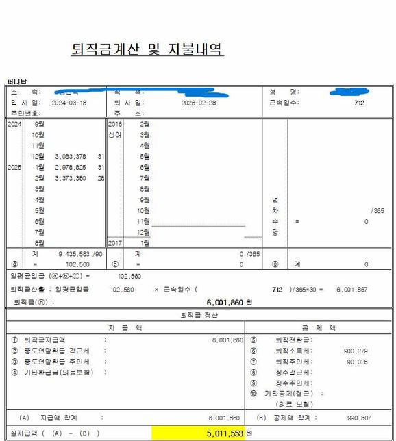 - 임금·급여고용·노동빠른가젤165퇴직금 세금 질문드려요... 세금이 과한거같습니다.퇴직금 세금이 100만원가량 나왔는데, 이게 맞는건지 의아하네요....사진 첨부합니다 세무사노무사님들 맞는지 확인 한번만 부탁드립니다 ㅜㅜ4명의 전문가가 답변했어요