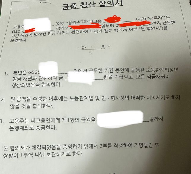 - 임금체불고용·노동씩씩한푸들175최저임금,주휴수당 못받고 퇴사 이틀뒤 금품청산합의서 작성했는데 못받은 돈 받을 방법이 아예 없는건가요?합의서를 작성하였더라도 결국 법을 어긴건 맞으니 제가 신고하면 점주는 처벌 받을 수 있는 건가요?만약 그렇다면 신고하지 않을테니 합의를 보자고 할 수 있을까요?합의서는 효력이 있다고 들었지만 어떻게 받을 방법이 없는 건가요..4명의 전문가가 답변했어요
