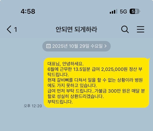 - 임금체불고용·노동화려한복어208기업회생 신청은 했는데 임금체불 문제로 질문 남깁니다.주변분들말로는 전에 회사가 임금체불 문제로 고소를 한번 먹었는데, 이번에 고소를 한번 더 하게 되면 받아야 월급도 못받게 된다 하시더라고요.지금 10월10일날 받아야 할 월급이 안나왔는데 11월10일에도 안나올 확률이 높다하셔서 이걸 고소해야될까요 …?3명의 전문가가 답변했어요