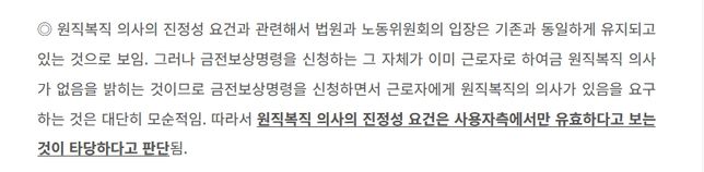 - 해고·징계고용·노동비장한얼룩말173부당해고이후 복직명령시에 진정성을 확인하는 기준이 무엇인가요?안녕하세요.부당해고를 당하여 현재 노동위원회에 금전 보상명령을 신청한 상황입니다.사측에서는 부랴부랴 저에게 복직을 해달라고 설득을 하던데요.일단 제가 금전보상명령을 신청한 상황이면 다들 아시다시피 전 복직을 할 의사가 전혀 없습니다.이제 문제는 그 다음인 진정성이 있냐 없냐인데요.ㅡㅡㅡㅡㅡㅡㅡㅡㅡㅡㅡㅡㅡㅡㅡㅡㅡㅡㅡㅡㅡㅡㅡㅡㅡㅡㅡㅡㅡㅡㅡㅡㅡㅡㅡㅡㅡㅡㅡㅡㅡㅡㅡ여기서 3가지 질문을 드려봅니다.첫번째 질문은 다음과 같습니다.으레 진정성이 있느냐 없느냐에 대한 판단은 다음과 같이 요약이 되더라고요.회사가 복직명령을 한 시점이 언제인가?회사가 복직명령을 하면서 그만큼의 보상을 해줄것이고 언제 얼마나 할지에 대한 의사 표시회사측이 잘못을 했다는점을 솔직하게 시인하고 그 점에 대해서 어떻게 앞으로 보완할것인지에 대한 구체적인 방안 제시부당해고를 당한 근로자에게 질답을 할 시에 질문에 대한 답을 똑바로 이야기 안하고 논점을 흐릴시위의 4가지건이 진정성이 있는지 없는지를 판별하는 기준이 되나요?제가 이해한게 맞는지 모르겠어요2번째 질문입니다.그리고 최근 사례를 보면 다음과 같은 경우가 있더라고요.이것은 최근에 개정된 내용인가요?만약 그러하다면 근로자인 제가 진정성을 입증할 필요는 없다는 이야기 아닌가요?위에서도 이야기했지만 저는 금전명령을 신청했기에 복직에 대한 의사는 없습니다. 그리고 3번째 질문입니다.제가 부당해고 건으로 인해서 현재 부당해고 구제신청을 해놓은 상황인데요.왜 내 의사가 없이 자진퇴사 처리 시켰느냐에 대한 질문을 다음과 같이 회피합니다.회사 사장이 자꾸 직원이 잘못했다라는 점을 이야기하네요.내가 회사직원에게 이야기를 했는데 회사 직원이 퇴사와 관련된 이야기를 저한테 하는것을 잊어버렸다. 그래서 내가 그 직원을 혼냈다 라는 식으로요.(일단 저는 회사에 퇴사의 의사와 사직서를 낸 적이 없습니다. 그러니까 무단으로 절 자른거죠)이런 경우에도 진정성이 없는걸로 판단을 내릴수 있나요?본인이 자꾸 잘못 없다는 식으로 이야기하는게 너무 화가 나네요3명의 전문가가 답변했어요