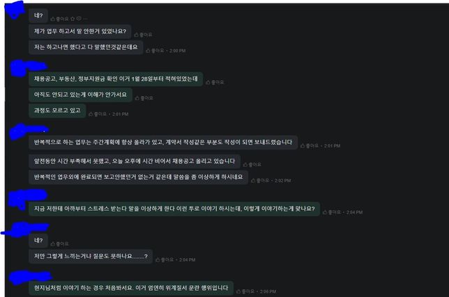 - 해고·징계고용·노동고혹적인나비263위계질서 문란?이 성립되는지첨부된 이미지와 같이 대화를 나누었습니다. 평소에도 보통 친절하지 않은 말투였는데, 오늘은 도를 넘어서는 것 같더라구요. 이 부분이 혹시 위계질서 문란 혹은 다른 걸로 문제 삼아 징계의 사유에 해당시킬 수 있는지 궁금합니다. 참고로 저희는 상시근로자 8인 사업장입니다. 취업규칙이나 이런 건 없습니다. 해고 하고 싶은데 한 번에 하기는 어렵겠죠? 혹시 징계에 해당하기 어려운 사유면 경고를 주고 같은 사유로 경고가 누적되었을 경우에는 징계가 가능한지 궁금합니다.7명의 전문가가 답변했어요