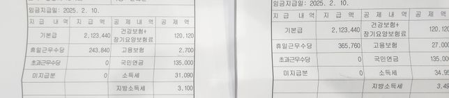 - 휴일·휴가고용·노동유리2453휴일근무수당 차이, 올바른 것인지 확인해주세요관공서에 다니고 있으며, 1월에 대한 명세서입니다.동료와 제 명세서를 비교해보니휴일근무수당에 차이가 커서요.휴일에 똑같이 근무했고, 임시공휴일에만 근무 여부가 다릅니다.다만 저는 임시공휴일도 유급휴일 처리 되는 것으로 알고 있는데요.(무급일에 명시 되지 않음)이정도 금액차가 어떻게 나올 수 있는지 여쭤봅니다.3명의 전문가가 답변했어요