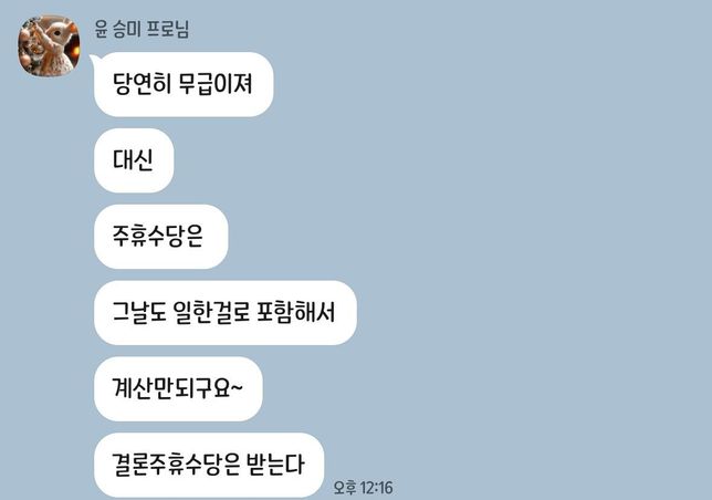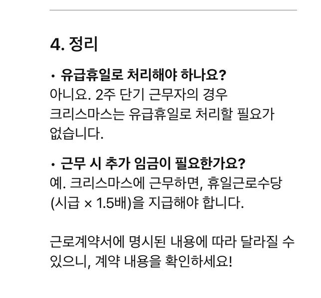 - 휴일·휴가고용·노동해기숙알바 공휴일 유급 휴가 지급 유무 질문 드려요안녕하세요 현재 2주 단기 계약으로 사무보조 알바 중인데요 이번 성탄절에 무급 휴가고 대신 그 날도 일한 걸로 해서 주휴수당만 받는다는데 유급휴가랑 주휴 수당은 각각 별개로 줘야하는 거 아닌가요?추후 지급하지 않으면 노동부 신고 가능한가요? 회사 답변 및 계약서 사진 첨부합니다.1명의 전문가가 답변했어요