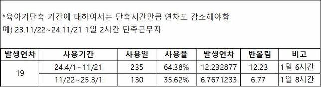 - 휴일·휴가고용·노동핫한여새118전년도 육아기단축근무자의 올해 연차발생 계산과 사용안내 어떻게 해야할까요?4월 1일자로 회계년도가 시작되는 회사입니다.하기와 같이 전년도 육아기단축근무를 사용한 근로자의 연차를 계산하였습니다.표면상 정상근무시와 동일한 19개의 연차가 발생하였고 다만 1일 6시간에 해당하는 연차가 12.23개, 1일 8시간의 연차가 6.77개가 계산되었습니다.연차사용에 있어서 근로자에게는 어떻게 안내를 해야할가요?1명의 전문가가 답변했어요
