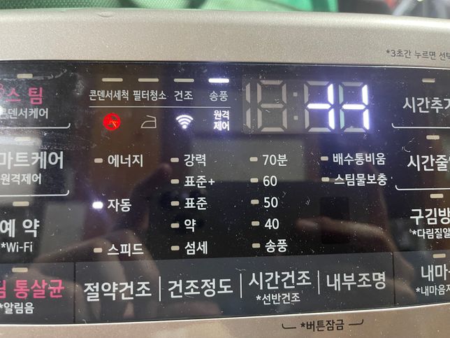 Lg 건조기에 상태를 나타내는 패널에서 다른것들은 조명이 잘 들어오는데 시간을 표시하는것 만 잘려서 나와요 잘 보니 가장 윗부분과 아랫부분 각각 2개씩이 안나오는것 같은데 원인과 해결방법이 궁금합니다