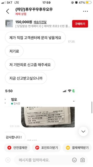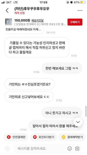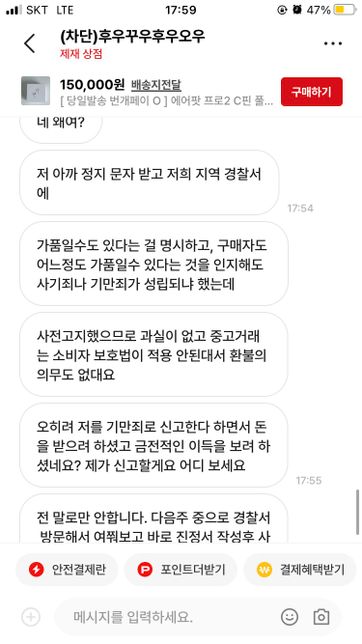 에어팟을 처음 설명글을 보고 구매를했습니다.자신은 가품인지 아닌지 몰랐다고 판매하고 제가 인지한 상태로 구매를했다며 오히려 저를 신고하려고 하네요. 이런경우는 어떻게 해결해야할까요