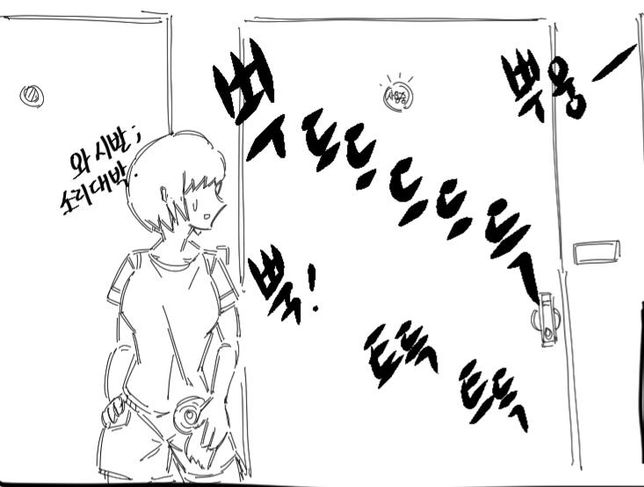 모바일게임의 한 팬만화를 보니깐 아침에 일어나일과를 준비하기 위해 흔히 말하는 모닝똥?을화장실에서 거칠게 밀어내며 싸는 장면이 있었습니다.근데 밖에서 (와...싸는 소리 대박..) 이런 말을하는데만약 이 말을 들었다면 너무 창피하지 않을까요?아니면 오히려 쿨하게 무시할까요?이 여캐는 이렇게 생겼습니다.