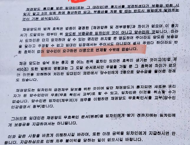 - 가압류·가처분법률덕망있는뻐꾸기195세입자가 전세보증금 담보로 채무 - 집주인 방안안녕하세요저는 집주인(임대인) 입니다.19년에 세입자가 전세보증금을 담보로 대부업체에서 돈을 빌렸습니다.그리고 서류를 작성하고 제가 서명까지 했는데서류에는 양수인(대부업체) 동의하에 보증금을 반납 하기로 한다라고 명시되어 있습니다.그리고 얼마전 세입자가 나가서 전세보증금을 세입자에게 돌려주었는데 제가 깜빡하고 양수인에게 알리지 않아서 양수인(대부업체) 측에서 저에게 세입자의 채무를 변제 하라고 합니다.제가 세입자에게 연락했는데 월요일까지 알아서 처리한다고 했습니다.이럴경우 저는 어떻게 해야 할까요?(세입자는 변제할 돈은 있는것 같습니다.그것이 현금은 아닐지라도 집이나 다른 재산은 있는것으로 보입니다.)Q1.세입자가 돈을 변제할 능력이 없다면 제가 변제해야 할까요?2.세입자가 변제를 했다면저도 이중으로 변제를 해야 하나요?(서류에 양수인의 동의가 없이 보증금을 주면 이중으로 변제한다고 되어 있어서요..)3.세입자가 변제할 능력(세입자 명의주택 또는 전세금)이 있음에도 변제하지 않는다면 제가 임차인에게 가압류를 걸어도 되나요?(대부업체 입장에서는 저랑 세입자 양쪽에 받으려고 가압류등의 액션을 취하고 있지 않은것 같습니다.)이외에도 제가 어떻게 대처해야 하는지 알려주시면 감사하겠습니다.1명의 전문가가 답변했어요