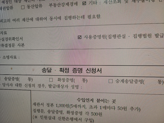 - 가압류·가처분법률아룽이집행문제도부여 신청서 작성시 수입인지 관련내용신청서에 수입인지 1500원 제출하라는 내용과 함께 송달 확정증명 신청서 란이 있고송달증명 확정증명 승계송달증명이 있는데제가 받고자하는건 재산조회와 채무불이행자 등록을 위한 집행문을 하나 더 받는걸 원합니다근데 여기서 궁금한게 제가 pdf파일로 판결정본과 송달 확정증명원을 가지고 있는데 수입인지가 필요한건가요? 송달 확정 증명을 체크해야하나요?압류결정문 사본은 압류된 내용을 인쇄해서 보내면 되나요?1명의 전문가가 답변했어요