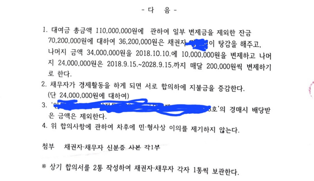 - 가압류·가처분법률홍이작렬합의서내용을 47개월동안 채무 불이행한 경우 채무불이행 소송이 가능한지요? 합의서 내용입니다.1천만원과 20만원씩 받은것이 480만원 총 1480만원은 받은상태 입니다.4번 민형상 이의 제기 하지 않는다로 되어 있어서 채무 불이행 소송이 가능한지요?그리고 먼저 합의를 채무자가 약속을 안지켰으니채권자가 탕감한 탕감비도 채무자에게 요구 할 수 있는지 궁금합니다.??3명의 전문가가 답변했어요