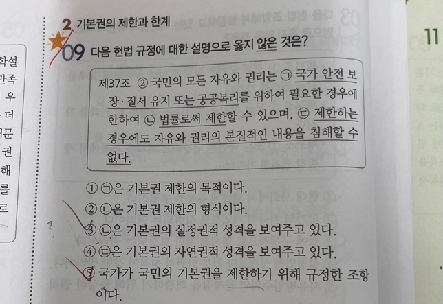 - 가족·이혼법률궁금한게너무많아미로같은세상속헌법 37조 기본권 제한은 국가가 국민의 기본권을 제한하기 위해 규정한 조항이 아닌가요? 정치와 법의 문제인데 헌법 제 37조 기본권 제한 내용이 국가가 국민의 기본권을 제한 하기 위해 규정한 조항이 아닌가요?? 왜 오답인지 궁금해요..1명의 전문가가 답변했어요