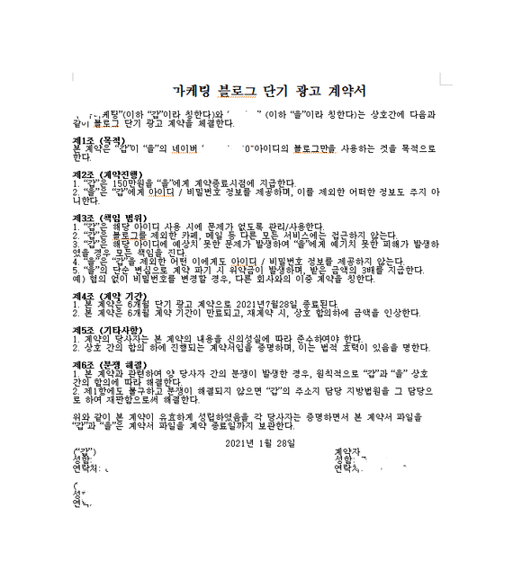 기업·회사법률굉장한참매281블로그 대여를 했는데 계약을 계속 해야되는지 중간에 연락을 끊어도되는지제가 대행사에 블로그를6개월마다 대여로 계약하였는데알고보니깐 그걸 다른대행사에 제 블로그를 팔고그 대행사쪽에서 광고를필요로하는 회사에 영구대여로팔았다고 하더라고요그런데 이번에 그 산 회사에서 연락와서자기는 영구대여로 샀는데 알고보니 대행사쪽에서 사기를 친거더라고요그래서 그 사기를 당하신분이 제 계약서가 계약의 효력을발휘못한다고 자신과 블로그를 직접계약하자고하더가고요계약서에는 불이행시 2배를 뱉어내야 된다고 하더라고요이때 제가 이 계약을 계속 안지켜도 불이행이없는지 궁금합니다2명의 전문가가 답변했어요- 기업·회사법률나른한생쥐89돈이 필요해서 고수익 알바를 알아봤는데.. 어떻게하죠..?제가 등록금때문에 돈이 필요해서 고수익 알바라고 해서 지원을 했습니다. 그러니 처음에는 10만원을 입금하면 실장님한테 전화해서 사모님 번호 받으라고 해서 했더니 또 30만원을 입금해달라고 해서 입금했습니다... 그러니 법인 계좌 특성상 수수료 때문에 계좌가 묶였다고 하고 다시 받으려면 30만원을 다시 보내라해서 보냈습니다. 그런데 이게 묶여서 70만원을 보내라하고 전화했더니 회사도 피해가 가서 입금하라고 지금도 문자가 옵니다.... 연락 안받으면 고소를 하겠다고... 어떻게 해야할까요...3명의 전문가가 답변했어요