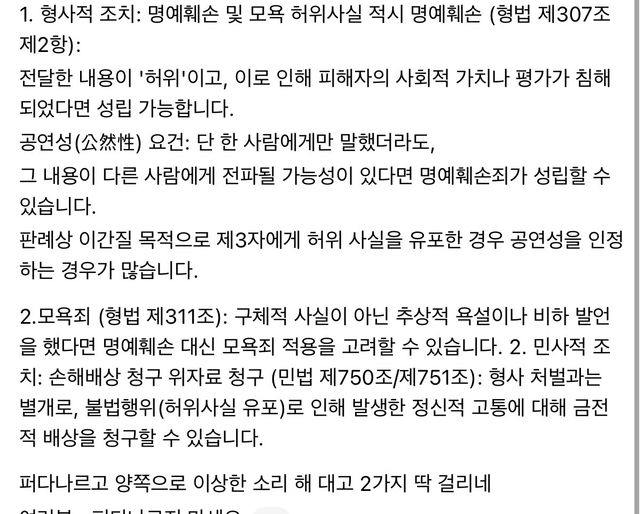 - 명예훼손·모욕법률위용있는남생이69명예훼손 관련되서 질문드립니다. 이거 맞나요?이 글에 관해 검토 부탁드립니다.단 한사람에게 말해도 명예훼손이 성립되는지 궁금하고글 전체적으로 맞는 얘기인지 궁금합니다. 감사합니다1명의 전문가가 답변했어요