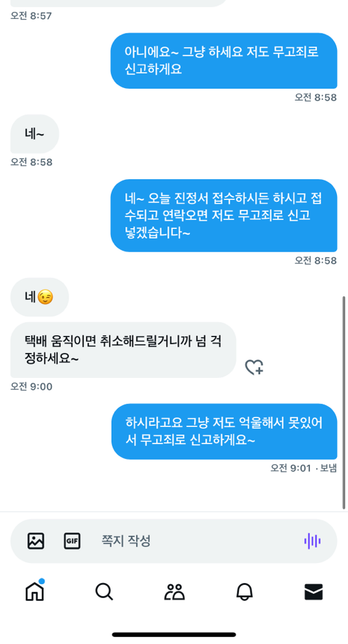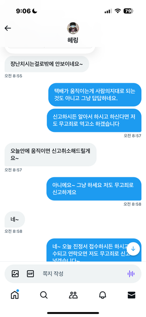 - 명예훼손·모욕법률탈퇴한 사용자아래 내용 무고죄로 신고시 성립이 가능할까요?택배를 보내드렸습니다 (4월17일 오전8시22분경) 운송장을 그래서 보내드렸는데 갑자기 오늘 아래처럼 디엠이 왔는데 신고될시에 역으로 무고죄로 처벌이 가능할까요2명의 전문가가 답변했어요
