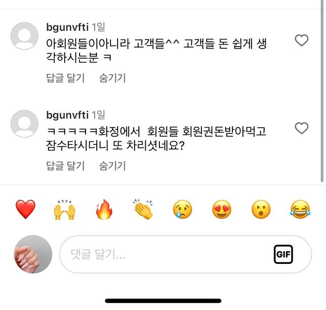 - 명예훼손·모욕법률견실한매사촌267인스타그램 댓글 모욕죄? 명예훼손?안녕하세요. 네일 직원을 두고 있는 왁싱 원장입니다.직원분께서 이전 샵 네일회원권 환불로 다툼이 있었는지환불금액은 전부 돌려줬는데도 불구하고저희 계정 게시물 댓글에 이렇게 댓글을 달았는데요어떤 방법으로 조취를 취할 수 있을까요 ?2명의 전문가가 답변했어요