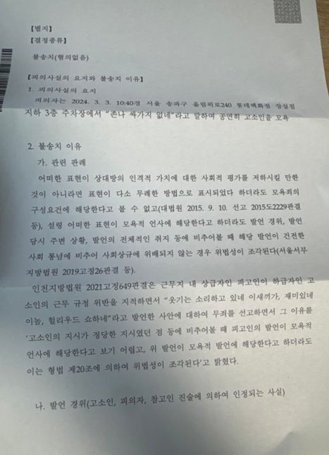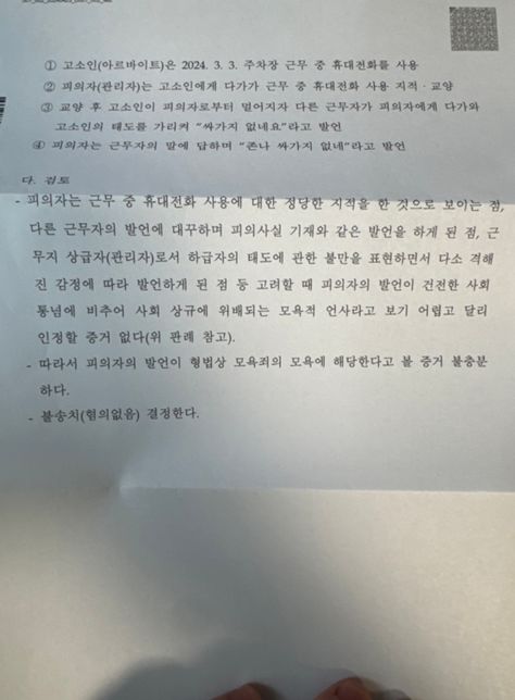 - 명예훼손·모욕법률안녕히주임이 “싸가지 존나 없네” 이의신청하여 검찰로 사건을 넘기셨다는데주임이 모욕해서 고소를 했고 불송치 떠서 추가 증거 추가해서 이의신청서 제출후 오늘 사건을 검찰로 넘겼다는데요. 두번째 사진처럼 “근무중 휴대폰사용으로 정당한 지적” 이라고 되어있는데 저는 알바생입니다. 사건이 발생한시각은10:4~50분 입니다.근데 근로계약서 상 근로 시작은 11:00인데계약서 상으로 따지면 근무중으로 볼수없고근무외에 일어난 모욕으로 볼수있지 않나요??의견서 같은거는 경찰서 사건번호 작성하여국민신문고로도 접수가 가능할까요자꾸 여쭤봐서 죄송합니다.너무 억울하고 속상해서 그렇습니다.정말정말 죄송합니더3명의 전문가가 답변했어요