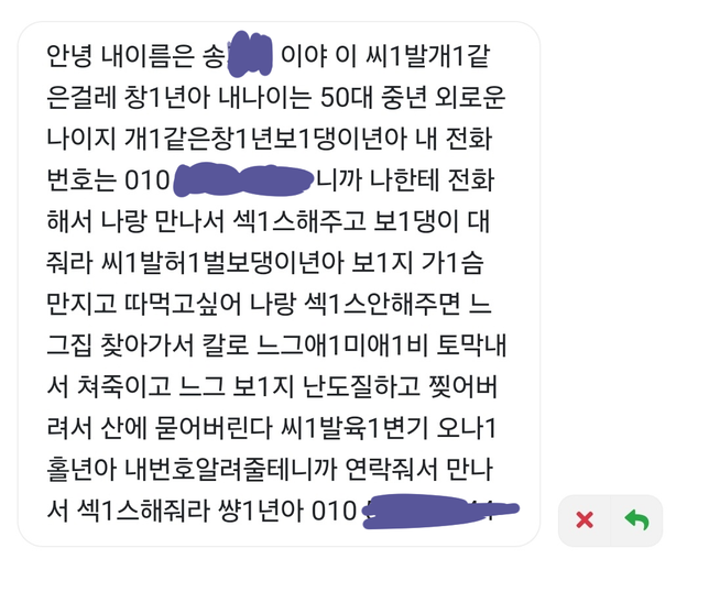 - 명예훼손·모욕법률다시봐도기분좋은순두부푸슝 수위높은 메시지들 고소 가능한가요?푸슝이라는 익명 에스크 사이트에서 스팸성 메시지를 받았습니다. 근데 너무 욕설이나 성희롱 수위가 높아서 고소가 가능한지 아님 ip추적해서 잡을 수 있는지 여쭙고싶어요. 제가 차단을 했다가 메시지 자세히 더 확인하려고 차단해제를 했는데 그대로 메시지가 사라져버려서 사진밖에는 안남았네요.... 이거 잡을 수 있는 방법 없을까요? 이름이랑 전화번호는 일단 가려놨습니다1명의 전문가가 답변했어요