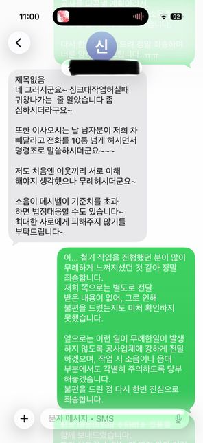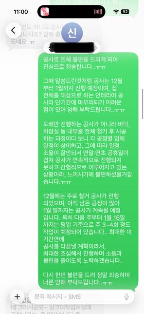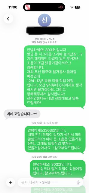 - 부동산·임대차법률그래도산뜻한감자탕빌라 실내 전체인테리어관련 공사소음으로인한 분쟁건 문의드립니다.안녕하세요. 시어머님이 집을 사셨는데 13년 된 빌라이다 보니 디자인과 집 상태가 너무 올드해서 셀프 인테리어를 해드리고 있습니다. 최근 공사를 진행하면서 이웃과 공사 소음으로 인해 분쟁이 생겨 문의드립니다.11월 말에 공사하기 전에 해당 빌라의 모든 세대를 돌며 소정의 선물과 함께 허락을 받았습니다. 원래는 사인을 받으려고 했으나, 관리 세대에서 사인은 받지 않아도 되고 건물 공지 네이버 밴드에 올려두면 된다고 하셔서(이전에도 그렇게 다른 세대 리모델링을 진행했다고 합니다) 구두로 모든 세대의 허락을 받았습니다.특히 어머님 아래층은 직접적인 영향이 있을 것 같아 해당 호수를 방문했을 때 더 주의를 기울였습니다. 당시에는 친절하게 괜찮다고 하셨고, 아이가 공부 중이라 공사 전에 문자를 주면 공사 날은 독서실을 예약하겠다고 하셔서, 모든 공사 시작 전에 아래층에만 모든 공정을 문자로 공지했습니다. 또한 건물 입구에 인테리어 일정을 매주 공사 전에 공지문으로 부착했습니다.그런데 철거를 진행할 때 철거 기사님과 다툼이 있으셨고, 그 이후부터는 문자에서 처음의 친절한 태도는 보이지 않고 계속 거칠게 대응하고 있습니다.공사 기간은 12월, 1월 두 달 동안 주 2-3회 간헐적으로 진행된다고 모든 세대에 말씀드렸고(아랫집은 기억이 안 난다고 하고 있습니다) 실제로도 그렇게 진행했습니다. 12월은 철거 한주를 제외하곤 거의 공사 진행을 못했습니다. 하지만 아래층의 불만이 커져 어떻게 대응해야 할지 모르겠습니다. 실제로 소송으로 진행된다면 저희가 비용을 지불해야 하거나 질 가능성이 있을까요? 어떻게 하는 것이 좋을까요?현재 소음이 큰 공사는 목공이 01.08~01.09 진행 중이며, 다음 주 타일 보수 공사가 01.12 예정되어 있습니다. 삼 일만 지나면 소음은 많이 줄어들 것 같은데 너무 머리가 아프네요 ㅠㅠ