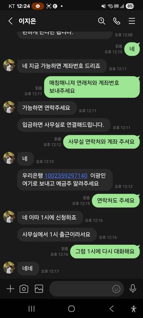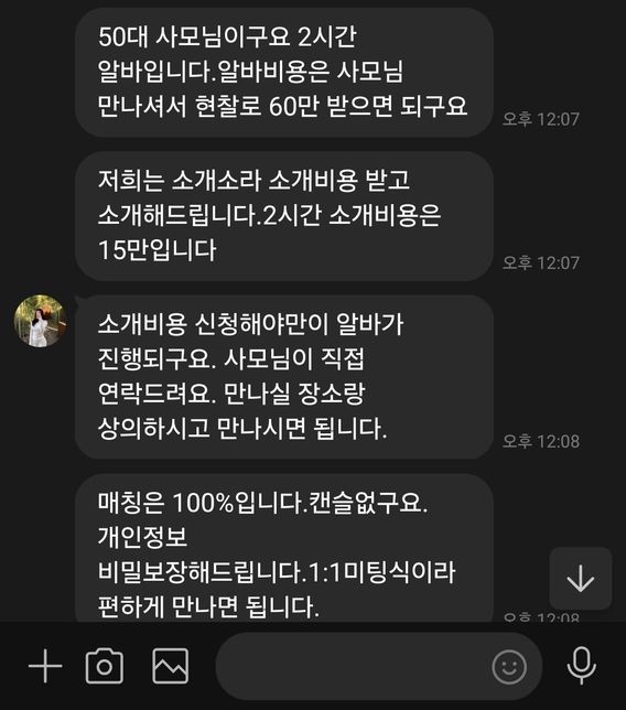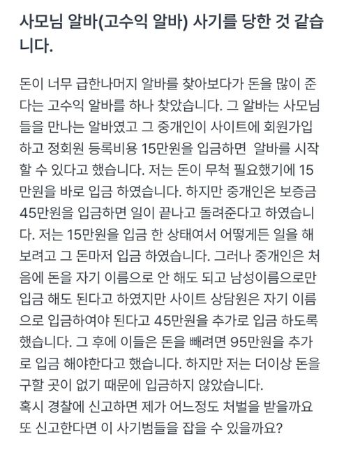 - 성범죄법률아직도엄준한석류고수익 알바 매칭 사기가 근절되길 바라며고수익 알바근처 사모님 2시간 60 만원 준다는 현금알바..누구나 솔깃할만한 제안이다.소개비용 15만원보내면 바로 매칭이 된다.ㅋ이런 사기꾼...아래 사진에 사기꾼이 쓰는 계좌번호가 있다..사무실 연락처와 계좌번호 달랫더니 계좌는 보내주고 사무실 연락처는 오후 1시에 보내준단다..이런 개 쓰레기 같은 사기꾼들이 많다조심들해야 된다..절대 몸과 맘이 편안한 고수익 알바는 없다..1명의 전문가가 답변했어요