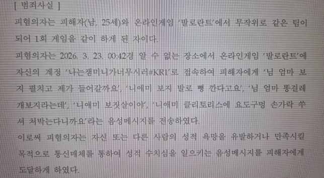 - 성범죄법률최고로빵터지는닭꼬치통매음 관련하여 질문드립니다!!!통매음 관련해서 경찰에서 전화가 왔는데 '니 고추 3cm라고 채팅치셨죠?' 이 말만 하시고 조사 받으러 오라고 하셨습니다. 제가 궁금한 것은 이 말이 제일 핵심인지 아니면 경찰관분께서 다른 성적인 발언이 문제가 있는데 말씀을 안 해주신 건지 궁금합니다. (제가 그당시에 채팅을 뭐라고쳤는지 기억이 나지 않는 상황입니다.) 그리고 추가로 경찰분께서 리그오브레전드라는 게임에서 채팅으로 싸우다가 성적인 발언을 채팅으로 쳤다고 얘기까지 하셨습니다.2명의 전문가가 답변했어요