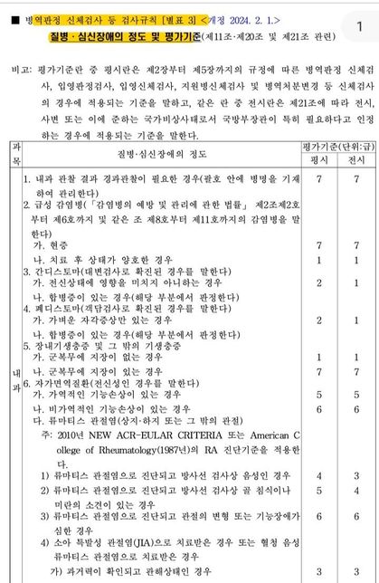 - 의료법률희망나무병역등급에 대한 문의 및 검사규칙에 기재된 의학용어 해석에 대한 문의입니다병역판정 신체검사 등 검사규칙에 기재된 의학용어 해석 및 병역등급에 대한 문의입니다 병역판정 신체검사 등 검사규칙 [별표 3](사진 별첨)에서, 라. 척추관절병증에서 등급에 대한 정도를 아래와 같이 구분하고 있습니다. ㅡㅡㅡㅡㅡㅡㅡㅡㅡㅡㅡㅡㅡㅡㅡㅡㅡㅡㅡㅡ 등급 정도 ㅡㅡㅡㅡㅡㅡㅡㅡㅡㅡㅡㅡㅡㅡㅡㅡㅡㅡㅡㅡGrade 0(정상) Normal Grade 1(의심) Suspicious Grade 2(경도) Sclerosis, some erosions Grade 3(중등도) Severe erosions, widening of the joint space, some ankylosis Grade 4(고도) Complete ankylosis ㅡㅡㅡㅡㅡㅡㅡㅡㅡㅡㅡㅡㅡㅡㅡㅡㅡㅡㅡㅡ 여기에서 Grade 1(의심) Suspicious Grade 2(경도) Sclerosis, some erosions 에 규정된 의학용어는 각각 무슨 의미로 해석(이해)해야 할수 있는지요? 병역판정 신체검사 등 검사규칙 세부내용에서 1) 척추관절병증으로 진단되고, 천장관절염증이 의심되는 경우에 3급으로 판정한다는 내용인지요? 2) 척추관절병증으로 진단되고, 천장관절염증이 한쪽 관절이 경도인 경우에 4급으로, 천장관절염증이 양쪽 관절이 경도인 경우 5급으로 판정한다는 내용인지요? 현재 대학병원에서 척추관절염으로 진단받고 MRI 검사결과 양쪽 천장관절에 염증발생이 확인되었고, 그 염증은 활액막염인 경우입니다. 양쪽 천장관절에 염증이 있으면 5급으로 판정을 받게 되는것으로 해석할 수 있다면, 양쪽에 활액막염이 생긴 경우에도 5급에 해당되는 것인가요? *병역판정 신체검사 등 검사규칙에는 1) 천장관절염증이 의심되는 경우 ㅡ 3급2) 천장관절염증이 양쪽 관절에 경도인 경우 ㅡ 5급으로 규정만 할뿐, 천장관절염의 세부종류는 규정하지 않고 있음을 참고로 해석해 주세요위 내용은 군입대와 관련된 중요한 질문입니다.자세한 답변 부탁드립니다.1명의 전문가가 답변했어요