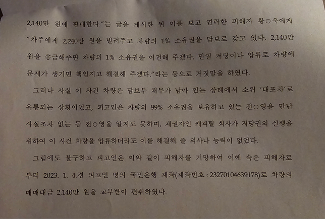 - 재산범죄법률불량감자사기죄 질문드립니다 차량관련 사건사기 죄로 재판이 잡혔습니다문의드립니다차량관련 사건인데8x 란 사이트에서 차량을 구매했습니다1%소유권을 준다는 말과 함께차주가 찾을때까지는 문제없을꺼란 얘길 듣고구입을 하여 타다가 저도 돈이 필요하여인터넷에 똑같은 글을 올려 판매를 했습니다소위 말하는 채권차량,또는 대포차라고도 불리는데문제는 제가 판매를 하고 그분이 한참 타다가갑자기 법원에서 압류하겠다며 차를 압수 당했습니다그러니 그분은 저를 이거 사기아니냐며 고소를한 상태이고요제가 정상적이질 않은 차량을사고 판게 죄라면 죄 맞습니다인정하는데 억울한 상황입니다기소 내용에는 제가 처음부터 문제될지 알고판매를 한 사람마냥..문제될지 알면 저인들 그렇게 구매를 했겠습니까저한테 차량을 사간 사람이 차값을 물어내라고고소를 한 상황인데합의가 어려운 상황입니다이렇게 재판이 진행될 경우 어찌되는지요구속까지 될 수 있는 건지요?합의하면 큰 문제는 없다는데합의가 어려운 상황이라서 합의는 힘들것 같습니다너무 스트레스 받고 신경이 쓰이는데구속 가능성이 얼마나 될까요?26일이 공판기일이라고 출석하라는데나가면 뭘 하는지요?검찰조사도 따로 받아야 되는줄 알고 있는데검찰조사도 없이 바로 재판이 잡힌건 안좋은건지요?전문분야로 계시는분들께 한말씀 상세히 듣고싶으니도움부탁드립니다구속 가능성이 있다면 준비를 해야 될게 많아서요3명의 전문가가 답변했어요