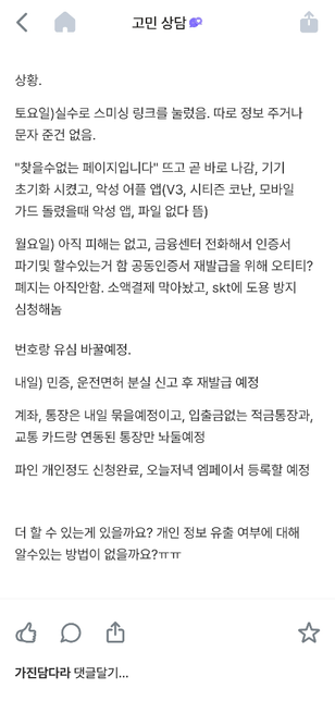 - 재산범죄법률가진담다라스미싱 링크 눌렀는데 대출 막을수 없을까요?아직 피해 받지는 않았는데, 대출 피해가 많이 보이저라고요ㅠㅠㅠ 대출 막는 방법이 따로 있을까요? 개인적으로 할수있는 방법 다 했다고 생각하는데ㅠㅠ2명의 전문가가 답변했어요