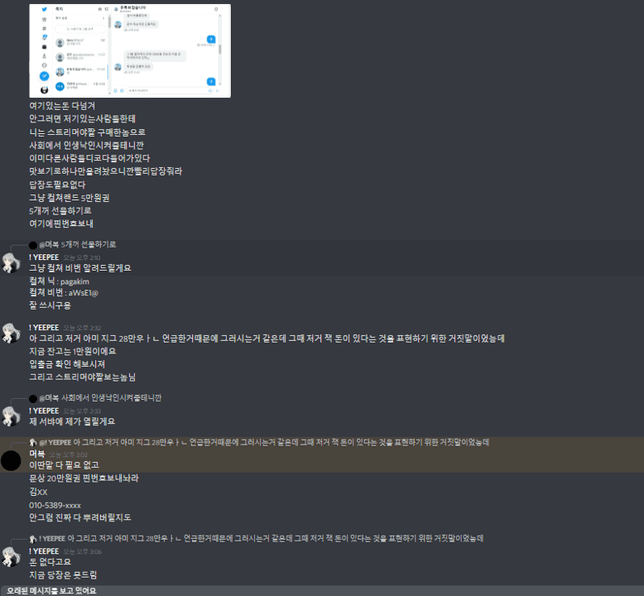 - 지식재산권·IT법률검소한후투티10온라인 디스코드 사기 관련 질문 드립니다.안녕하세요, 현재 초등학교 6학년인 학생입니다.최근 성교육을 받을때 일명야동, 야짤에 대해서 알려주셨는데,트위터에 찾아보니 '스트리머 야짤'이라는게 있길래 구매해 보았습니다.요러모로 궁금했기도 하고..근데 파일을 열고 전 충격받아서 바로 삭제했습니다.그때였습니다. 디스코드로 연락이 왔습니다.일명 '머복'이라는 사람이 제 모든 신상정보와 나이, ip까디 알고 있다면서 보여주었습니다.그러고는 저를 향해 말했습니다.'저 사회에서 매장당하기 싫으면 당장 문화상품권 20만원 나한테 보내'라고 말이죠.안보내면 다른 사이트 및 제 서버에 제가 구매했다는 사실을 유포해버린다고 협박까지 했습니다.당시 제가 이벤트에 당첨해서 모은 돈 20만원을 구 사람에게 주게 되었고, 저는 그렇게 20만원을 뜯기게 되었습니다. 그리고는 사과문을 쓰라더군요. 그래서 썼습니다.근데, 이제 다음달에도 준비해라?라고 답이 왔습니다.안한다고 하니까 제 신상을 뿌려버리는거에 모자라 제 유튜브나 네이버, 구글 등의 모든 사이트에 봇을 사용하여 너가 샀다는 것을 뿌리겠다, 내가 너 고소하면 벌금 2000만원일텐데 내가 1000을 달랬냐, 고작 20인데.고작.고작?? 초딩에게 20은 매우 큰돈입니다. 우러러볼 수도 없죠. 제가 약 2년동안 이벤트에 당첨되서 모은 돈들이 다 날렸습니다.저도 더이상은 못참겠고 그래서 여기에 질문 올립니다. 증거도 첨부하겠습니다.고소를 하고 싶은데, 법정 대리인의 동의가 필요하다고 합니다. 부모님깨 들키기는 싫고, 오히려 일만 더 커질 것 같습니다.혹시 시간 가능하신 변호사님 한분 디스코드 가능하시다면 댓글에 달아주세요..이런 부탁 너무너무 죄송합니다..Floss flow#4813디스코드 입니다.