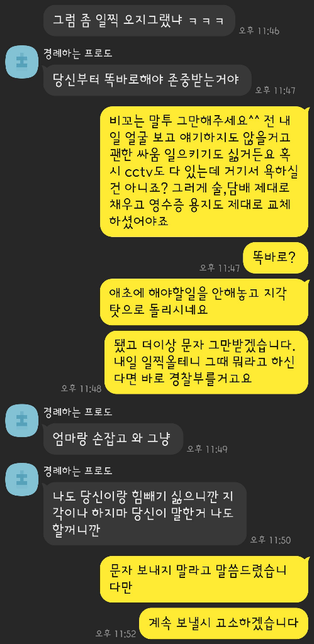 - 지식재산권·IT법률예쁜토마토해당 카톡 메세지를 정보통신방법 위반,협박죄로 고소할 수 있을까요?편의점 알바를 하고있는 대학생입니다. 평일 야간에 근무하는데 상습적으로 2분정도 늦게와서 평일오후 근로자에게 한소리를 들었습니다. 제 잘못이 맞습니다 근데 문제는 이 교대자는 항상 물건을 채우고 교대해야되는데 그냥 놔두고 퇴근합니다. 오늘은 심지어 영수증 종이를 교체하지 않고 가서 큰일이 날 뻔 했습니다. 보통 영수증 종이가 바닥나기 직전에 영수증을 출력하면 빨간색이 출력된 종이에 묻어나옵니다. 그래서 쉽게 알 수 있는데 이사람은 그것도 손을 안대고 간겁니다. 매일 그럽니다. 그래서 제가 카톡을 했습니다. 나:당신뭐야? 어이가 없어서 ㅋㅋ당신이나 똑바로 담배 채우세요 술도 제대로 맨날 안채우고 교대하면서 영수증 용지도 오늘 내가 교체했다 점장한테 말할거고 누가 이기나 봅시다 난 잘려도 상관없고요 당신이나 일 똑바로 잘해 상대방:ㅋㅋㅋㅋㅋ 앞에서는 죄송합니다 죄송합니다 그래놓고 채팅으로는 아주 깡패 인척하네 누가 이기나 보자고 ? 무섭네 협박도 하고 안되있는게 있으면 벙어리 처럼 있지말고 말을하지 그러냐 ? 너 그래서 일부러 쳐 늦게 왔지 ? 근데 너 왜 아까 죄송하다 그랬어 ? 니가 거기서 억울한게 있음 말을 쳐해야할꺼아냐 나:응 일부러 늦게 쳐온거 아니고요 말 똑바로 하세요^^ 그거에 대해서는 죄송하다고 말했고요 이게 어딜뵈서 협박인지 모르겠네요? 협박이라고 말하는걸 봐서는 찔리는게 있나보죠? ㅋㅋ거기서 싸움나면 득될거 하나 어보(없)는데 굳이 싸움 내서 뭐해요 ㅎㅎ상대방:알았어 채팅이나 계속쳐 내일 얼굴보면서 얘기하자고 ㅎㅎ나:싫은데요 ㅎㅎ 말이나 똑바로 해주세요 혹시 화나신건 아니죠 ㅠㅠ 쨋든 점장에게 말씀 드리겠습니다상대방:학교에서 쳐맞던거 선생님께 자주 일렀나보네 멋쟁이네내가 일찍오라고 한소리 들은게 그렇게 억울했음?그럼 좀 일찍 오지그랬냐 ㅋㅋㅋ당신부터 똑바로해야 존중받는거야 나:비꼬는 말투 그만해주세요^^ 전 내일 얼굴 보고 얘기하지도 않을거고 괜한 싸움 일으키기도 싫거든요 혹시 cctv도 다 있는데 거기서 욕하실건 아니죠? 그러게 술,담배 제대로 채우고 영수증 용지도 제대로 교체하셨어야죠 똑바로? 애초에 해야할일을 안해놓고 지각탓으로 돌리시네요 됐고 더이상 문자 그만받겠습니다. 내일 일찍올테니 그때 뭐라고 하신다면 바로 경찰부를거고요상대방:엄마랑 손잡고 와 그냥 나도 당신이랑 힘빼기 싫으니깐 지각이나 하지마 당신이 말한거 나도 할꺼니깐나:문자 보내지 말라고 말씀드렸습니다만 계속 보낼시 고소하겠습니다이렇게 해서 약 15분간의 대화가 끝났는데요 이걸 협박죄,정보통신망법 위반으로 고소가 가능한 사안일까요? 카톡대화 캡쳐도 첨부합니다2명의 전문가가 답변했어요