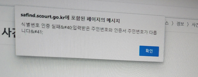 - 지식재산권·IT법률유연한메추리53대법원 나의사건 검색 관련 질문드려요.민사 소송으로 원고인 제강승소를 한 상황이고이와는 별개로 재산명시 신청서와 그외 필요한 서류를 법원에 11월 중순에 보내놓은 상태 입니다.어제 사건 진행상황을 보려고 인증서로 검색 들어가서 주민등록번호를 치는데 이런게 떠서 문의 드립니다. 식별인증번호실패와 입력받은 인증서 주민번호가 다르다는데 뭐가 잘못 클릭된건가여?1명의 전문가가 답변했어요