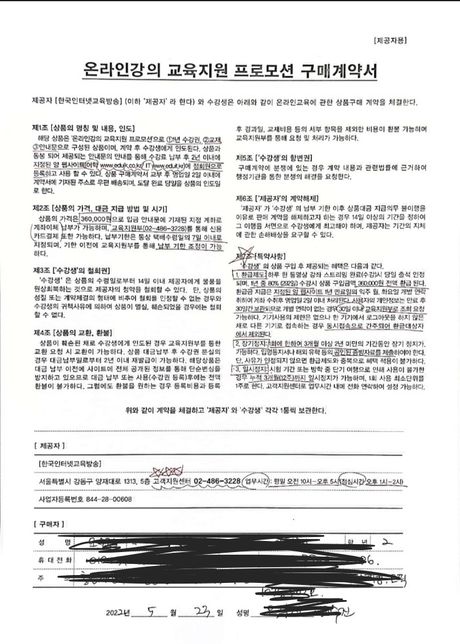 - 지식재산권·IT법률비상한갈기쥐192인터넷강의 위약금 질문드립니다 ㅠ대학교에서 인터넷강의 설명해주셔서 그때는 하고싶은생각에 계약서를 작성했다가 까맣게 잊어버리고360000원을 납부하지않고 사용권등록 및 강의 이용을 하지않았습니다그러다가 8월 11일 목요일 한국인터넷교육방송 측에서 문자로 360000원을 내지않으면 내용증명 발송될수 있다고 하여 한국소비자원과 통화하고 360000원은 소비자원도 부당하다고 생각해서 교육방송측에 얘기하였습니다. 그랬더니 108000원을 납부하라고 전화가 왔습니다. 그래서 왜 108000원인지 얘기를 해달라고 하였더니 위약금 20프로와 교재비 36000원이라고 하였습니다. 그래서 그거에 대한 내용을 증명할수있는 서류를 문자로 좀 보내달라했더니 통화로 다 설명했다고 통화녹음되는 폰을 사라고 공격적으로 말씀하시길래 조금 다투다가 마지막에 서류 보내준다고해놓고 문자로 계약관련 처리가 지체될거같아 배상책임에 관한 통고문을 발송한다고 합니다. 그래서 다시 전화했더니 13만원가량을 내라고 하네요 합법적인경우면 내야겠지만 혹시 이중에 이쪽 강의측에서 불법적으로 저희에게 돈을 받아내려는 것이 있나요? 아니면 관한 법률같은것이 있나요?ㅠㅠ소비자원과 연락이 너무 힘들어 질문올립니다.2명의 전문가가 답변했어요