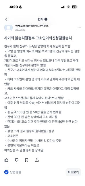 - 형사법률현재도소심한티라노사우루스경찰불송치후 국민신문고민원 검찰재송치첨부사진내용으로 경찰불송치후 검찰재송치되었는데경찰불송치는 혐의없음이었고이번 검사처분이 3.12일되었는데보완수사요구로 되어있어요금액도 소액익지인이었던관계여서어차피 줘야할 돈이라 생각하고 넘기려는데너무 화가납니다지금 민사적으로도 진행중이고휴전 사실 다단계영업에 당한거라 생각도들지만그렇게 주장하면 상대가 너무 집요하고 막무가내여서그런말 없이 그냥 이렇게된거 빨리해결하자 이거였어요지금 잔액은 30남았고형사고소 사기 인정할수없는데보완수사요구너무화가납니다이런경우 어떻게 해야하나요?그리고 이런경우 보완수사에서 달라질경우가 있나요?2명의 전문가가 답변했어요