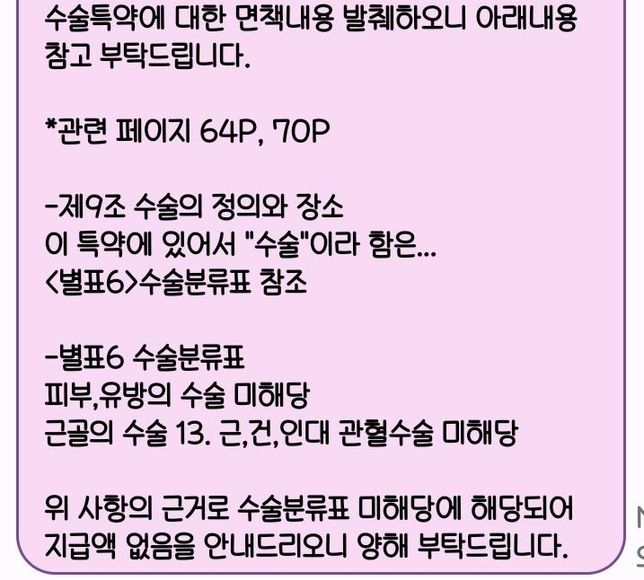 - 의료 보험보험끝없이생각하는자라새마을금고 지방종 D179 코드 보험청구권 잘 아시는 분~~~얼마전 허벅지(양성 지방종성 신생물) D179코드를 받았습니다.의사소견서(연부조적종양 적출술 시행받은 환자로 미용목적 아닌 압통으로 인한 수술/단, 합병증 및 병발증발생시 추가 진단가능함)수술확인서. 조직검사결과지.세부내역서 제출하였으나1.가입된 질병수술특약(질병으로 그 치료를 직접 목적으로 수술시*라고 기재되어있었으나) !!근육층이 아닌 단순 피부절제술이라 종수술에 미해당 된다며 거절을 당했습니다. 보험가입은 2008년7월에 새마음금고에 가입되었고, 약관을 봤을땐 종수술에 관한 내용이 없다라고 말하니. 거절을 하셔서.약관을 참고할 내용을 알려달라 하니 저리 메시지가 왔습니다.보험금 청구가 불가능한지 알려주세요ㅠㅠㅠㅠ