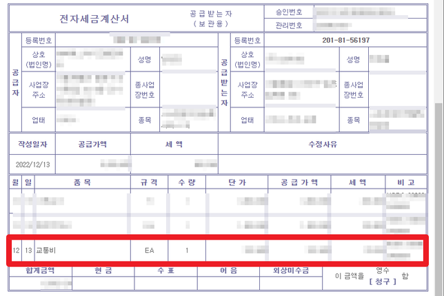 안녕하세요서비스를 공급받은 사업체입니다.청구 품목에 교통비라는 이름으로 청구를 받았습니다.해당 교통비라는 내역은 전자세금계산서를 발급한 공급자의 비용처리 항목이 아닌지요?해당 교통비는 서비스 총액의 일부금액에 녹아서 청구가 되어야하지 않나 문의드립니다.