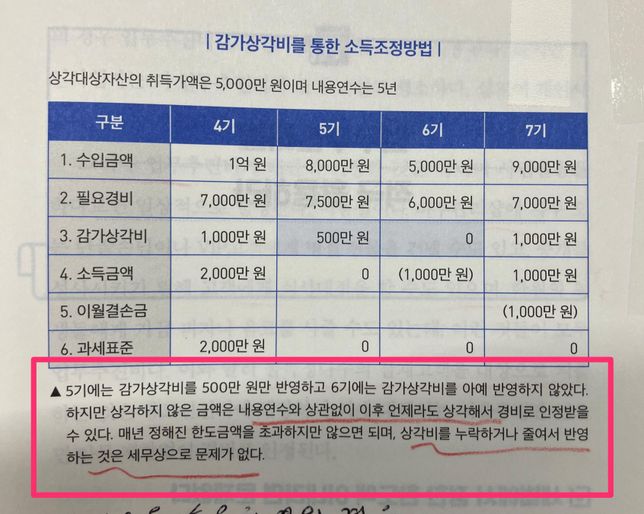 - 종합소득세세금·세무위용있는물수리151종합소득세 신고시 차량 감가상각비 조정 문의드립니다안녕하세요간편장부대상자인 개인사업자의 경우1억짜리 업무용 승용차를1월에 구매해서 정률법으로감가상각을 하면 아래 처럼 될것 같은데요1년차 - 4510만원2년차 - 2475만원3년차 - 1359만원4년차 - 746만원5년차 - 908만원(409만원+남은 잔존가액 498만원-1000원)총 감각상각 금액 = 9,999만원감가상각은 최대한 한도액만 초과되지 않으면 중간에 누락하거나금액을 줄여서 신고해도 문제 없다고되어 있는것 같은데 아래와 같이 신고해도 문제가 되지 않을까요?1년차 - 3,000만원 (최대 적용 가능액 4,510원에서 감액해서 신고)2년차 - 누락3년차 - 3,157만원(남은 금액 7,000만원*0.451)4년차 - 누락5년차 - 3,842만원(남은금액 3,843만원*0.451+남은 잔존가액 789만원-1000원)총 감각상각 금액 = 9,999만원답변 주신 모든 세무사님들께미리 감사의 인사드립니다오늘도 좋은 하루되세요1명의 전문가가 답변했어요