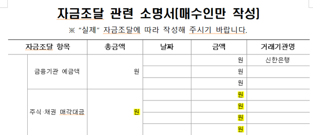 - 취득세·등록세세금·세무예쁜청가뢰52구청, 부동산 거래 신고 조사 대상 정밀조사에 따른 자료 제출 요청안녕하세요.구청에서 부동산 거래 신고 조사 정밀 조사 공문 받았습니다.'자금 조달 소명서'에서 '금융기관 예금액'과 '주식 매각 대금'을 작성해야하는데요.어차피 1개의 메인 통장에서 가계약금, 계약금, 잔금 전부 나갔습니다.그러면 최종적으로 아파트 산 금액(가계약금 + 계약금 + 잔금) 전부 들어 있던 메인 통장의 '잔고 증명서'만 제출하면 되는 건가요?아니면 메인 통장에 잔금 치루려고 주식도 매각 했었는데, '주식 매각 대금'에도 금액을 산정해서 따로 증빙 해야하나요? 만약에 '주식 매각 대금'에 적어야한다면 관련 증빙 서류들은 무엇들이 있나요? '잔고 증명서'같은 경우는 매일 매일 금액이 달라지는데, 잔고 증명서로 증빙이 가능하면 무슨 날짜 기준으로 제출해야 하나요?2명의 전문가가 답변했어요