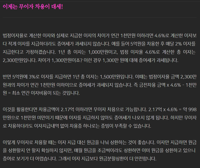 - 취득세·등록세세금·세무경건한오리30주택 구매를 위한 가족간 차용증 작성 시 이자 및 상환 금액 설정 방법은?주택 구매를 위하여 가족간에 차용증을 작성할때도 터무니 없는 상환 기관과 이자 금액은 설정할 수 없다고 들었습니다.그래서 6천만원을 빌린다고 가정하고 이자 및 상환 기간을 설정할 경우 법적 최소 이자 4.6%를 지급하도록 차용증을 작성해야한다고 했는데 관련 글을 읽다 보면 2.17억까지 빌릴 경우 4.6%로 빌려도 연 이자가 1천만원 미만이기 때문에 이자 없이 원금만 갚아도 된다라는 내용이 있습니다.그럼 계약서 상에는 이자를 4.6%라고 설정을 하더라도 상환기간을 10년 잡으면 6천만원을 10년 , 1년에 600만원, 1달에 50만원의 원금만 갚아 나가도 문제가 없다는 의미일까요?3명의 전문가가 답변했어요