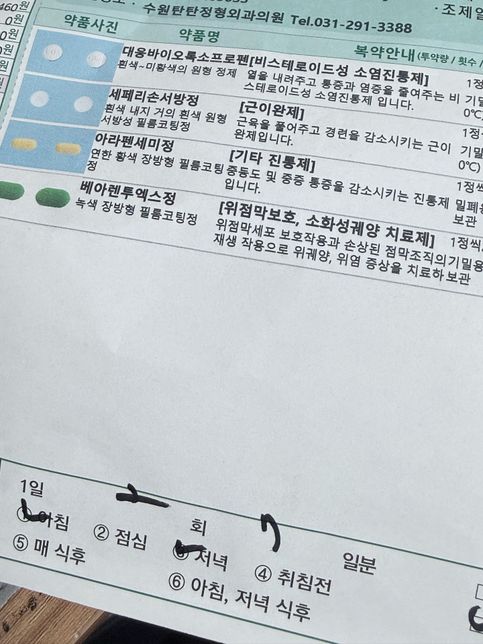 - 약 복용약·영양제Hj0207허리디스크 약 먹었는데 약효가 떨어지는건지 아픈데 한번 더 복용할수있나요?사진에 있는 약들 처방받아서 오후 5시쯤 복용했는데 통증이 점점 심해지는데 한번 더 복용 가능한가요? 이 약들 안되면 대체약으로 먹을수있는약 있나요?아침에 나프록센 한알 복용함오후 5시쯤 이른 저녁먹고 처방 받은 약 록소프로펜정 제외하고 복용함3명의 전문가가 답변했어요