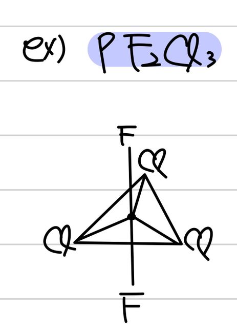 입체 장애가 아닌, 각 원소의 EN차이에 의해 반발력을 생각하고, 구조를 결정한다고 배웠는데요이 상황 같은 경우에는 P-F / P-Cl을 각각P-F 중 F의 전기음성도 큼, 전자쌍 잘 끌어당김 비교적 안정하므로 축에 배치P-Cl중 Cl의 전기음성도 약함, 전자쌍 F보다 못 끌어당김, P-Cl사이 전자쌍 많아 불안정 -> 적도면에 배치이렇게 생각해도 될까용